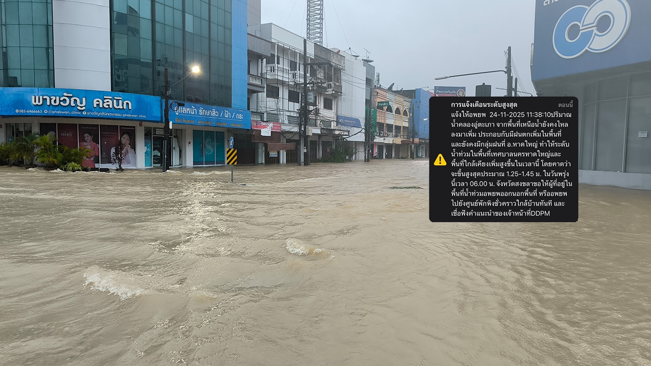 เมื่อวันที่ 24 พฤศจิกายน 2568 ผู้สื่อข่าวรายงานสถานการณ์น้ำท่วมในพื้นที่ อ.หาดใหญ่ จ.สงขลา ล่าสุดมีรายงานว่า กรมป้องกันและบรรเทาสาธารณภัย (ปภ.) แจ้งเตือนวันนี้ โดยระบุว่า การแจ้งเตือนระดับสูงสุด