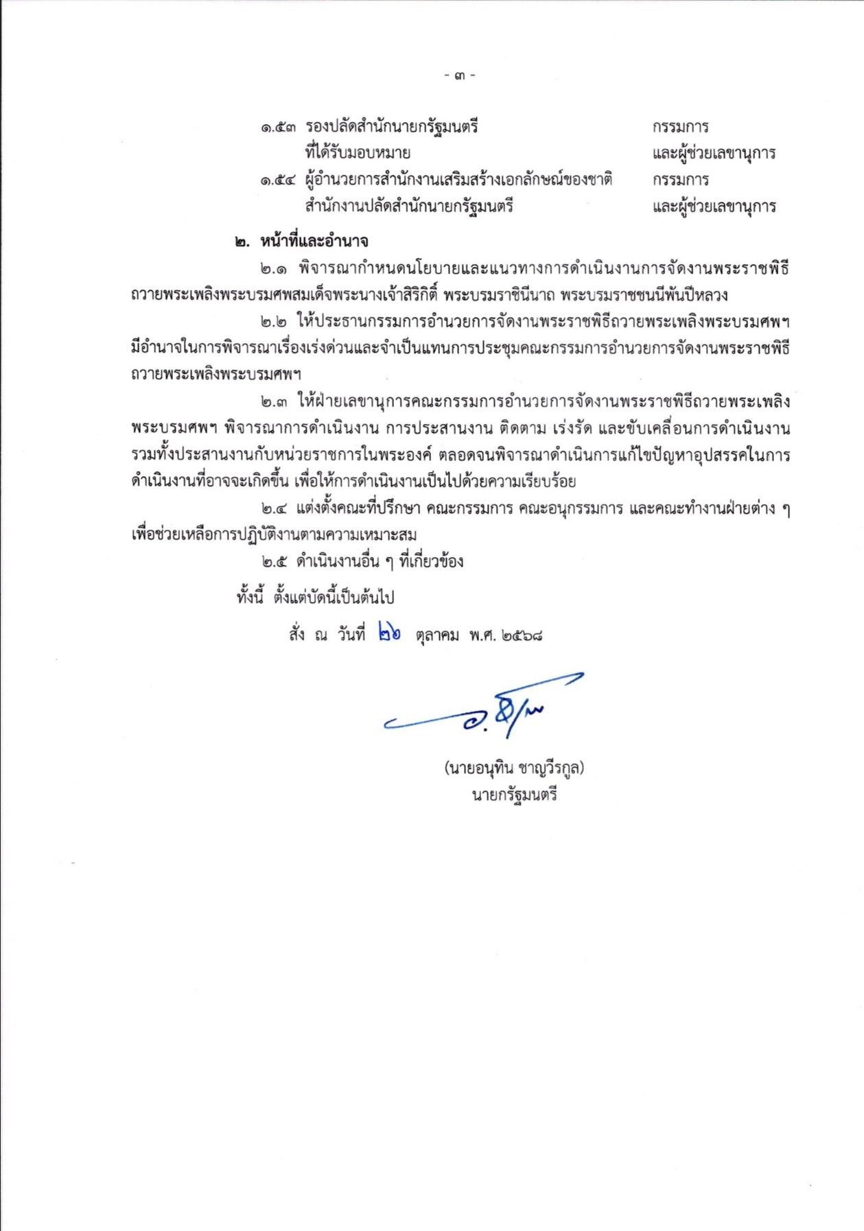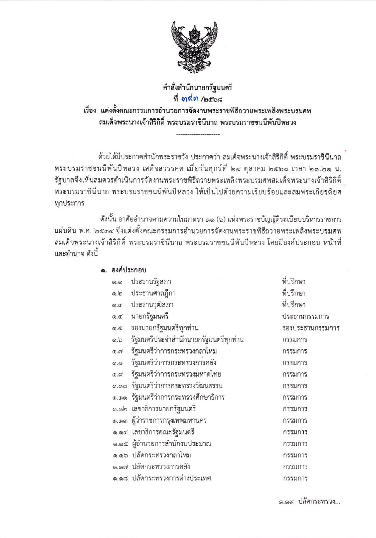 วันที่ 29 ตุลาคม 2568 ผู้สื่อข่าวรายงานว่า นายอนุทิน ชาญวีรกูล นายกรัฐมนตรีและรัฐมนตรีว่าการกระทรวงมหาดไทย ได้มีคำสั่งสำนักนายกรัฐมนตรี ที่ 393 /2568 เรื่อง แต่งตั้งคณะกรรมการอำนวยการจัดงานพระราชพิธีถวายพระเพลิงพระบรมศพ