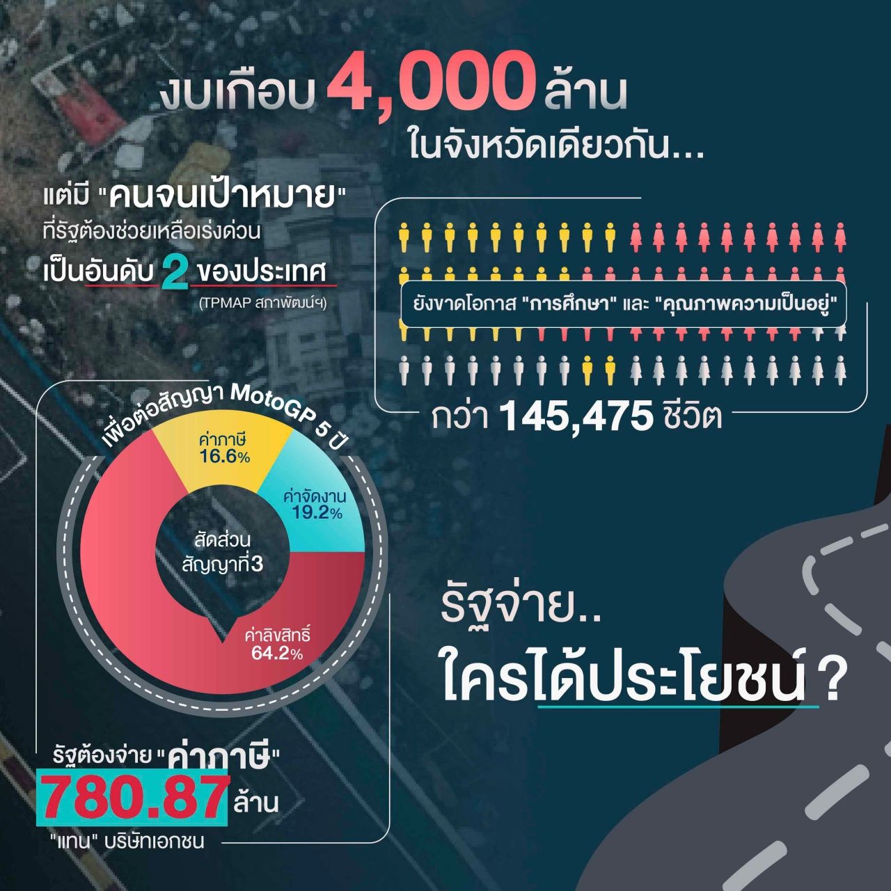 พ.ต.อ.ทวี กล่าวด้วยว่า ที่น่าเป็นห่วงคือรายได้เฉลี่ยต่อหัวของคนบุรีรัมย์อยู่ที่ 91,635 บาท/ปี “ต่ำกว่าค่าเฉลี่ยประเทศ 2.8 เท่า” และมี “คนจนเป้าหมาย” ที่รัฐต้องช่วยเหลือเร่งด่วน เป็นอันดับ 2 ของประเทศ มีกว่า 145,475 ชีวิต ที่รอโอกาสทางการศึกษาและคุณภาพความเป็นอยู่ที่ดีขึ้น แต่ มติ ครม. ไม่ได้ช่วยแก้ปัญหาความยากจน กลับตอกย้ำความเหลื่อมล้ำเพราะใช้งบประมาณมหาศาล เกือบ 4,000 ล้านบาท เพื่อจัดแข่งที่ สนามช้างฯ บุรีรัมย์ (พื้นที่บ้านนายกฯ อนุทิน) นี่คือการ “เอาเงินในอนาคตมาใช้” สร้างภาระ และทำให้งบประมาณยิ่งกระจุกตัวอยู่ที่พวกพ้อง ประชาชนทั่วไปถูกกันออกไปจากการมีส่วนร่วมเกือบสิ้นเชิง!