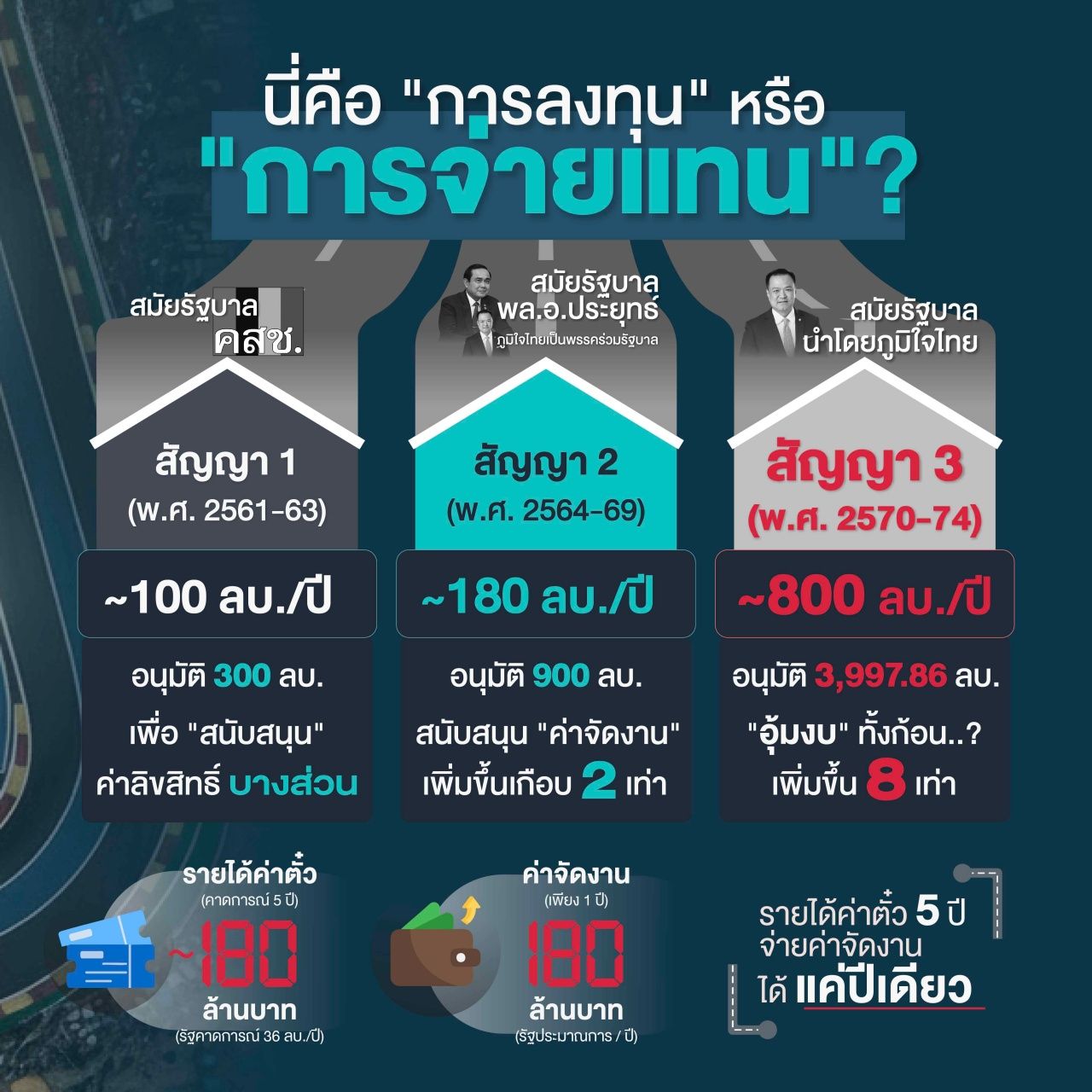 พ.ต.อ.ทวี กล่าวด้วยว่า การที่ภาระงบประมาณของรัฐพุ่งสูงขึ้นถึง 8 เท่า สะท้อนว่าโมเดลนี้อาจไม่ยั่งยืนในเชิงธุรกิจ และขาดความคุ้มค่า จนภาคเอกชนอาจไม่ร่วมลงทุน และรัฐต้องเข้ามา “จ่ายแทน” ข้อมูลในภาพตอกย้ำประเด็นนี้ชัดเจนว่า “รายได้ค่าตั๋ว” ที่รัฐคาดการณ์ตลอด 5 ปี (ประมาณ 180 ล้าน) เพิ่งจะเท่ากับ “ค่าจัดงาน” เพียงปีเดียว (180 ล้าน)