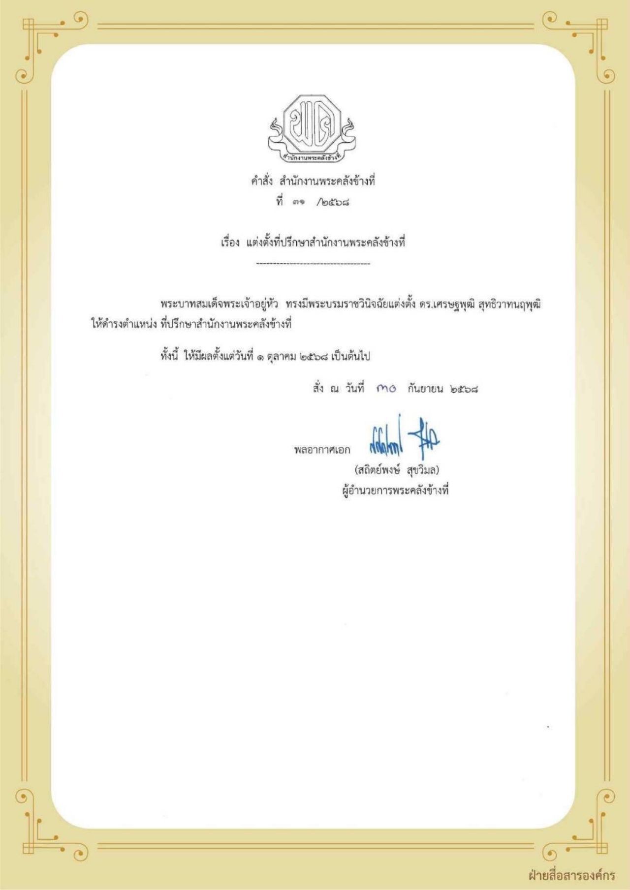 “พระบาทสมเด็จพระเจ้าอยู่หัว ทรงมีพระบรมราชวินิจฉัยแต่งตั้ง นายเศรษฐพุฒิ สุทธิวาทนฤพุฒิ อดีตผู้ว่าการธนาคารแห่งประเทศไทย (ธปท.) ให้ดำรงตำแหน่ง ที่ปรึกษาสำนักงานพระคลังข้างที่ ทั้งนี้ให้มีผลตั้งแต่วันที่ 1 ตุลาคม 2568 เป็นต้นไป”.
